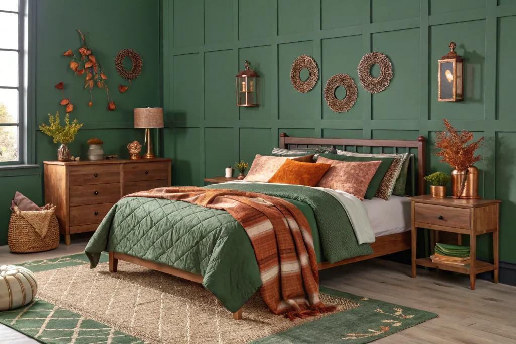 Green pairs beautifully with metallics, and copper is especially stunning in fall. A green bedroom accented with copper lamps, mirrors, or vases creates a glowing warmth that feels both seasonal and sophisticated. The metallic shimmer balances the earthy green tones, giving your room a perfect fall finish.