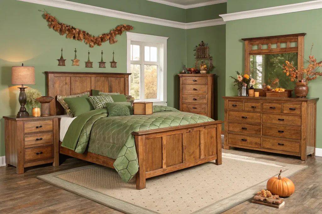 Furniture is an underrated way to add seasonal color. A painted green dresser, a vintage nightstand, or even a DIY repurposed bench in olive or hunter green can anchor your bedroom beautifully. Rustic pieces add charm, character, and a lived-in coziness that feels perfect for fall.