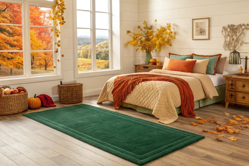 A rug in rich emerald tones grounds your bedroom and creates a sense of warmth underfoot. Rugs also add texture and pattern, which are key elements for fall decor. Whether you choose a solid emerald rug or one with subtle prints, it will instantly make your space feel more layered and cozy.