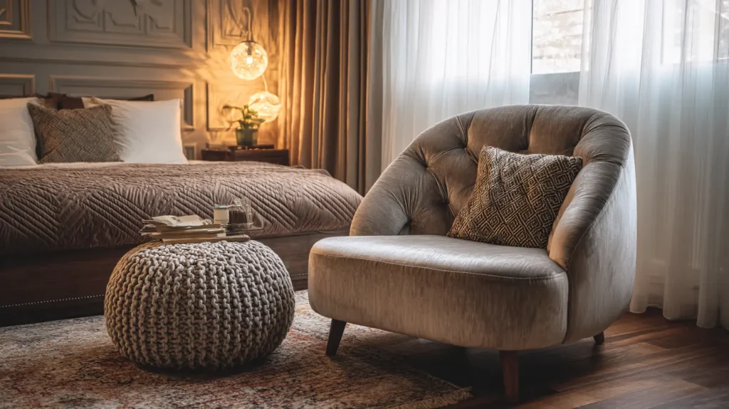 If you have space, create a small reading nook with a chair and floor lamp. Choose a soft, cushioned seat where you can curl up with a blanket and book. Add a small table for tea, books, or candles to complete the setup. This cozy bedroom idea is perfect for relaxing evenings. A reading corner adds both function and comfort to the space. It becomes a mini retreat within your bedroom.