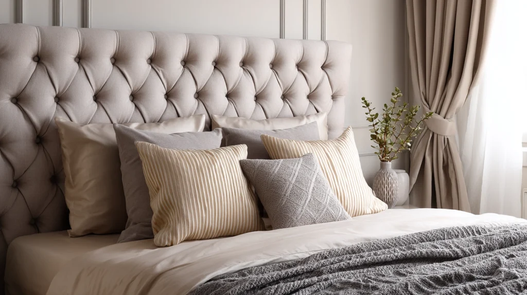 An upholstered headboard adds a layer of comfort and style. It makes sitting up in bed more enjoyable and keeps the room feeling soft. Choose fabric in warm tones like tan, blush, or gray. Tufted or padded styles add extra texture and coziness. This bedroom idea also gives your space a more finished look. It’s an easy way to make your bed feel extra special.