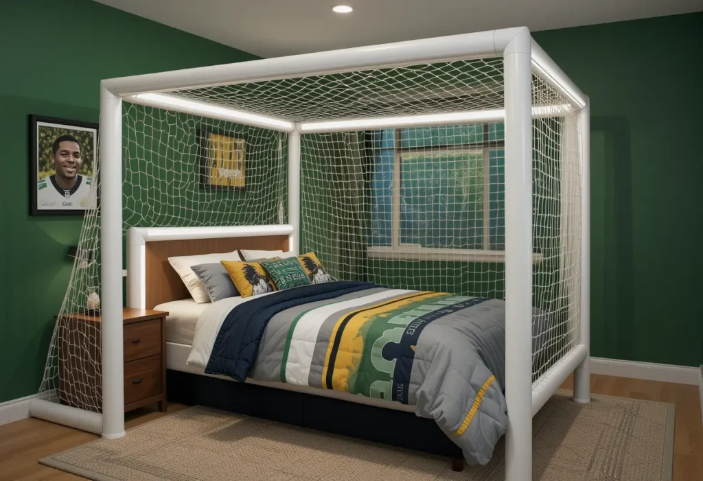 A goalpost bed frame turns bedtime into game time and gives the room an instant sporty edge. This idea is best because it doubles as both a functional bed and a bold statement piece that any football lover would admire. It creates a fun focal point and sets the tone for the entire theme without needing a ton of extra decor. The approximate cost is $300–$700, making it a relatively expensive upgrade.