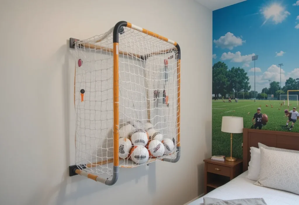 A wall-mounted goal net adds action to the room and doubles as decor and entertainment. This idea is best because it provides a play outlet without eating up floor space. It’s great for practicing shots with soft balls and adds instant flair. The approximate cost is $30–$80, making it a cheap to mid-range choice.