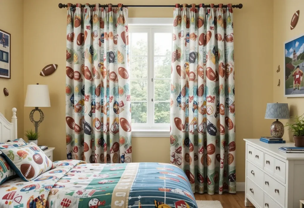 Football curtain panels block out light while keeping the decor team-spirited. This idea is best because it’s a practical necessity that adds bold design in one easy swap. It’s ideal for themed rooms without going overboard. The approximate cost is $30–$60 per set, making it a cheap to mid-range choice.