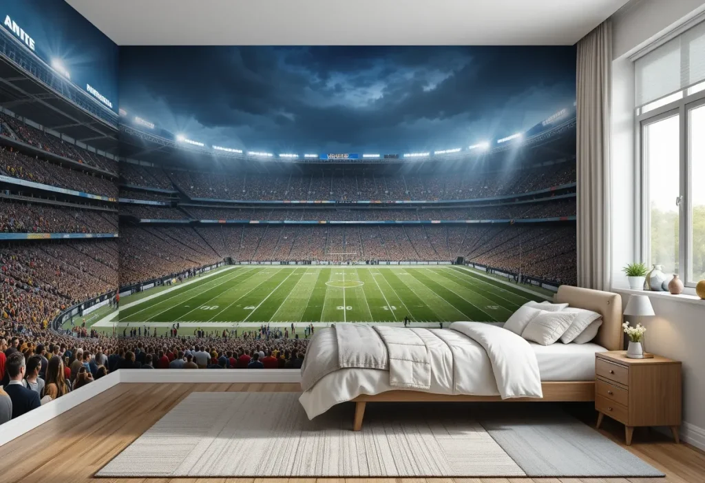 A stadium wall mural transforms any bedroom into a live match experience and brings massive visual impact. This idea is best because it creates an immersive environment and makes your child feel like they’re in the heart of the game. It works especially well on large walls and instantly enhances the space without clutter. The approximate cost is $100–$400, making it a moderately expensive choice.