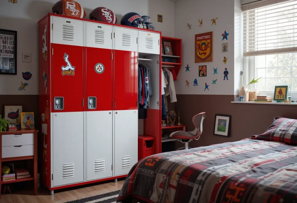 A mini locker nightstand adds personality and hidden storage next to the bed. This idea is best because it’s practical and fun, adding to the sporty locker-room vibe. It works great for keeping bedtime essentials organized. The approximate cost is $70–$150, making it a moderately expensive choice.