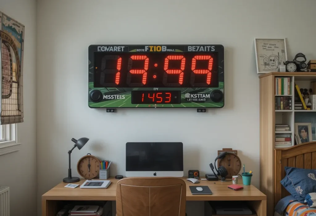 A scoreboard wall clock keeps time in theme and adds a game-day feel to the space. This idea is best because it replaces boring clocks with something bold and fun. It’s useful and keeps the decor cohesive. The approximate cost is $20–$50, making it a cheap addition.
