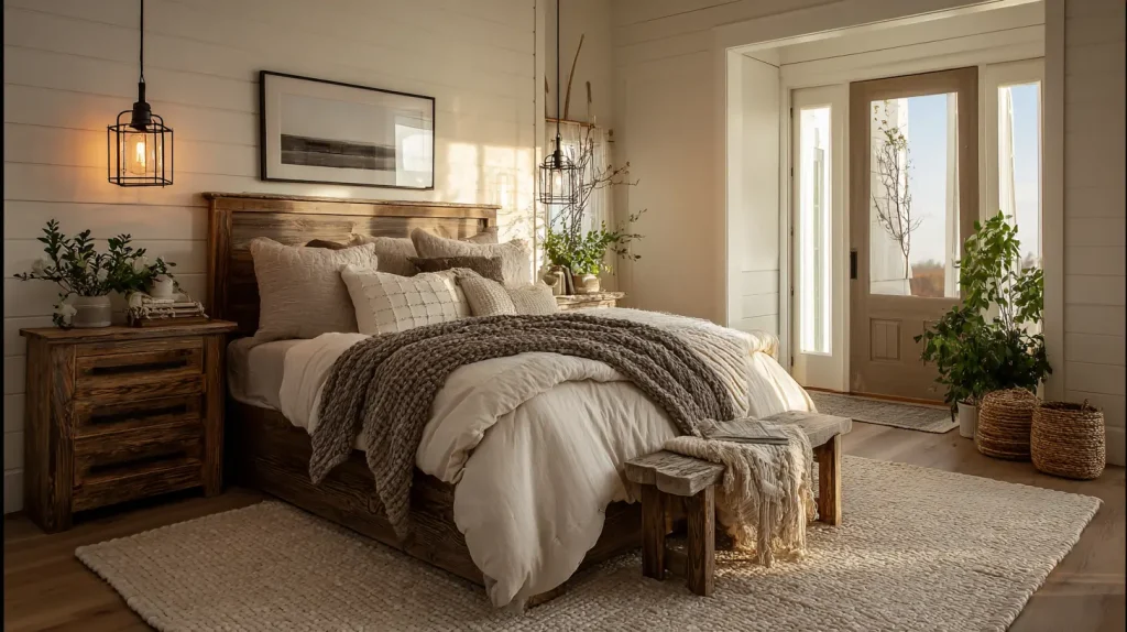 Build a grounded, earthy bedroom with warm tones like terracotta, olive, and deep browns. Add natural elements like clay pots, stone decor, and wood furniture. Use soft lighting to keep the space calm and welcoming. This style feels organic and deeply connected to nature. Layer different materials like linen, wool, and cotton to add comfort. It’s a relaxing retreat for people who love a warm, grounded atmosphere.