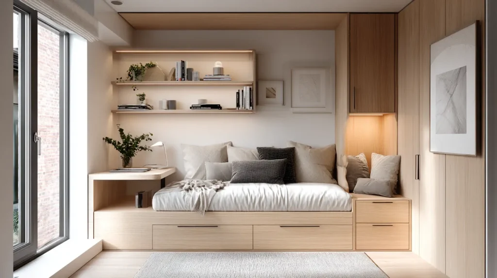Smart furniture that does more than one job is perfect for modern living. A bed with storage drawers or a desk that folds into the wall saves both space and energy. It helps keep the room tidy while still looking stylish and intentional. Multifunctional pieces are great for small rooms or shared spaces. They blend style with practicality, proving you don’t have to sacrifice looks for usefulness. This idea is all about making life easier and your room neater.