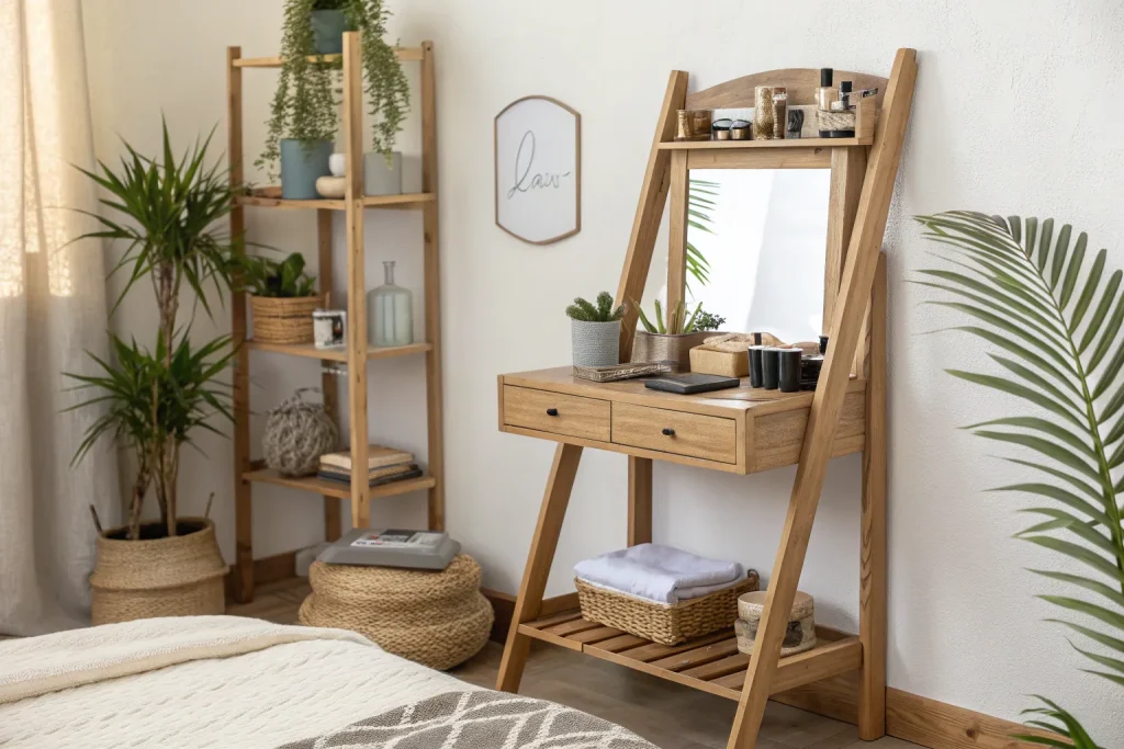 A ladder shelf vanity leans against the wall and provides shelves for both storage and décor. The middle shelf works as a tabletop for your makeup, while the rest holds beauty tools or decorations. It’s a great blend of style and utility. The approximate cost is $90–$180, making it a moderate option. It’s perfect for small rooms that need vertical storage.