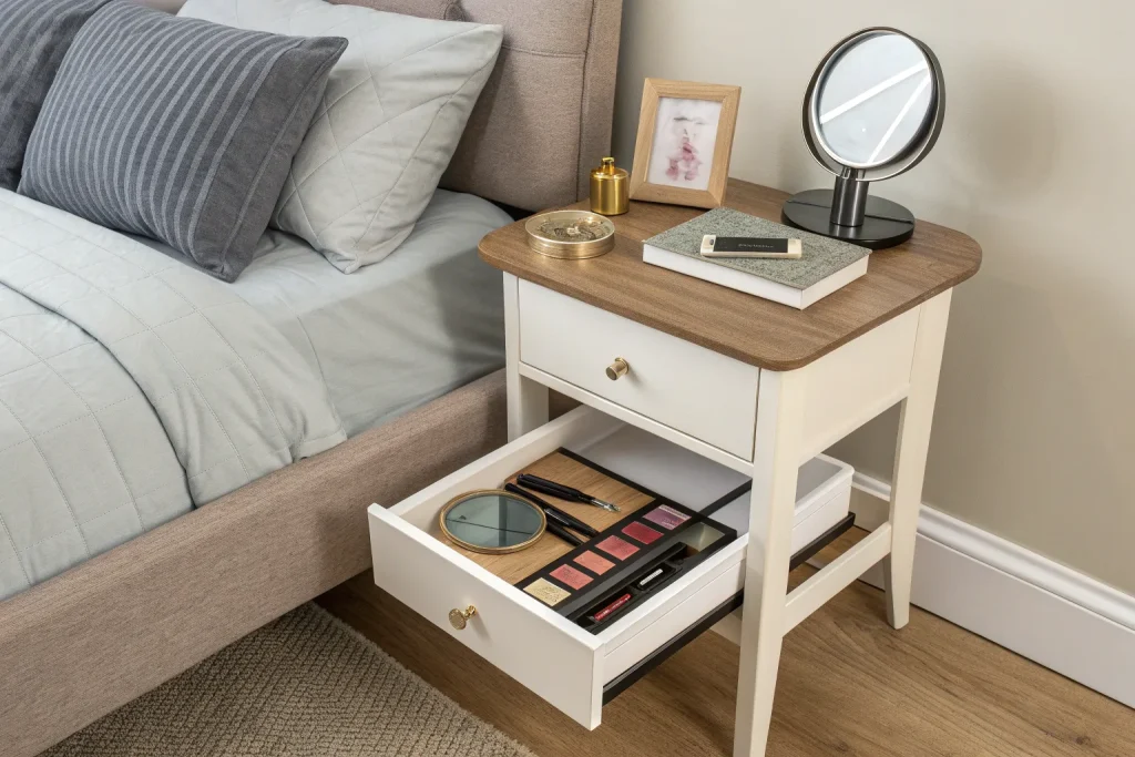 A bedside vanity with pull-out top lets you get ready without leaving your bed, perfect for lazy mornings or small rooms. The pull-out surface works as a quick makeup station and slides back when done. It’s discreet and space-efficient. The approximate cost is $60–$130, making it a cheap-to-moderate choice. It’s a blend of comfort and practicality.