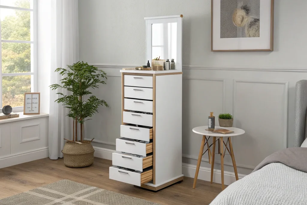 A compact makeup tower uses vertical drawers to store everything in a slim design. It’s perfect for small spaces that can’t fit wide furniture. Add a mirror on top for a complete vanity setup. The approximate cost is $50–$120, making it a cheap option. It’s ideal for keeping products organized without taking up much space.