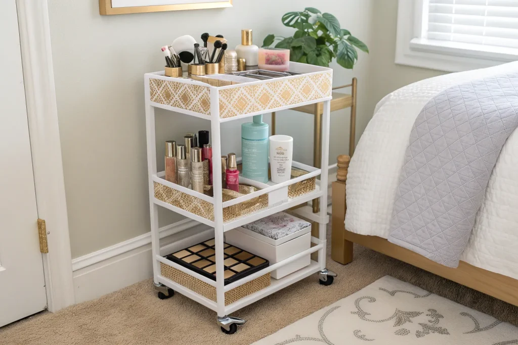 A portable vanity cart is perfect for small bedrooms because you can move it wherever you need it. It keeps all your beauty products organized and can be stored away when not in use. This flexibility is great for multi-use rooms. The approximate cost is $40–$90, making it inexpensive. It’s the ultimate mobile beauty station for tight spaces.