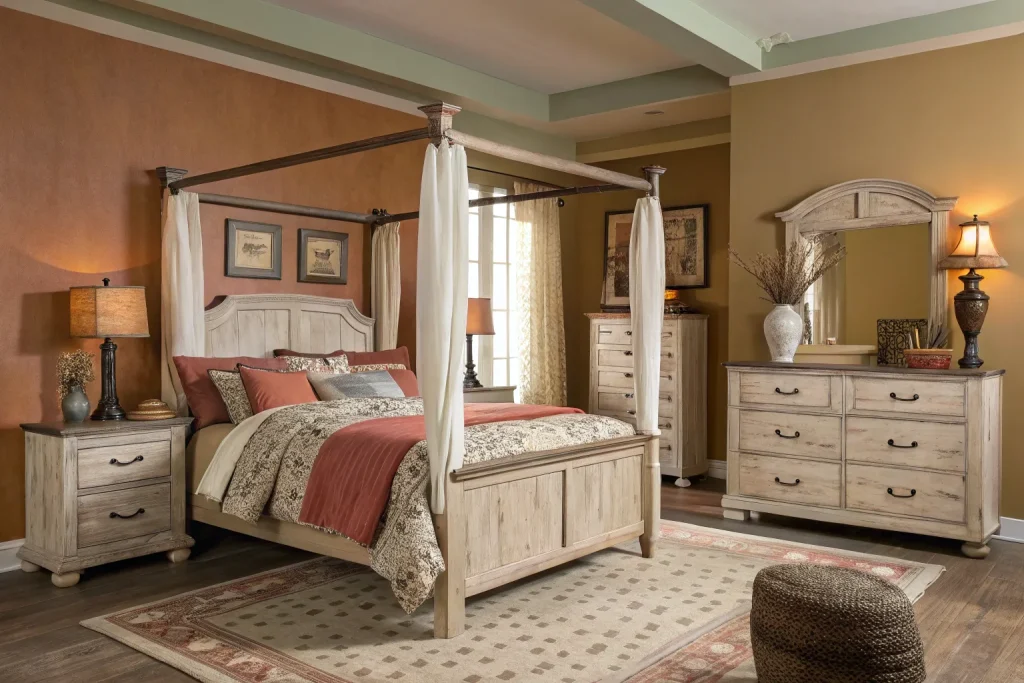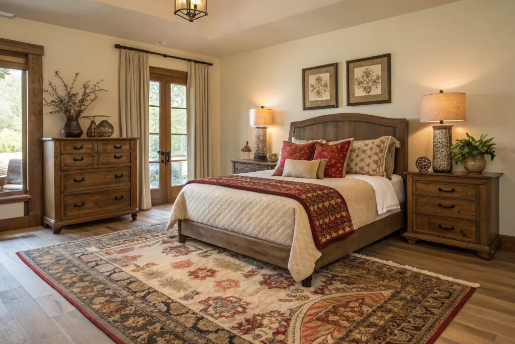 Bedding in rust, olive, or beige sets the foundation for coziness. Expect to spend $70–$200, which makes this moderately priced. Warm bedding colors make the whole room feel softer and inviting. It’s a quick swap with high impact.