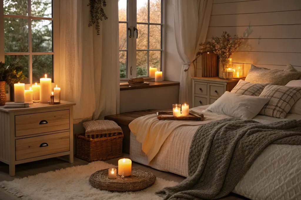 Scent defines coziness just as much as décor. Candles or diffusers cost about $20–$60, which makes this a cheap upgrade. Scents like vanilla, cedar, or sandalwood create a calming, warm atmosphere. It’s a sensory layer that makes your room feel complete.