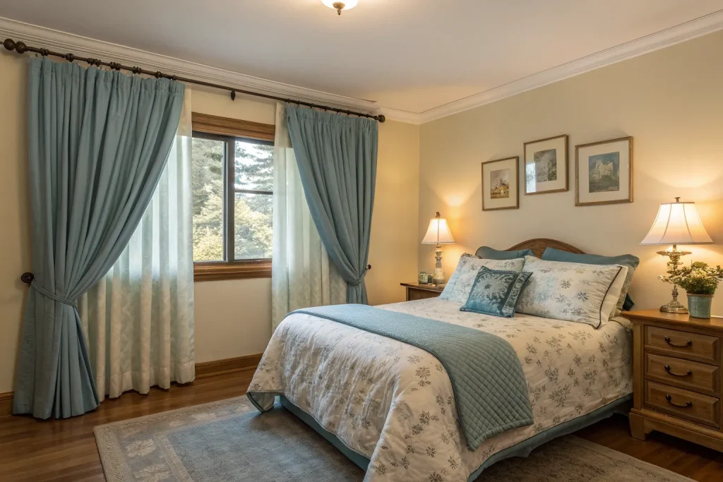 Blinds feel cold, but thick curtains add softness and warmth. Expect to spend around $100–$250, which makes this moderately expensive. Curtains in linen, velvet, or cotton instantly change the mood of your bedroom. They also make sleeping far too tempting.
