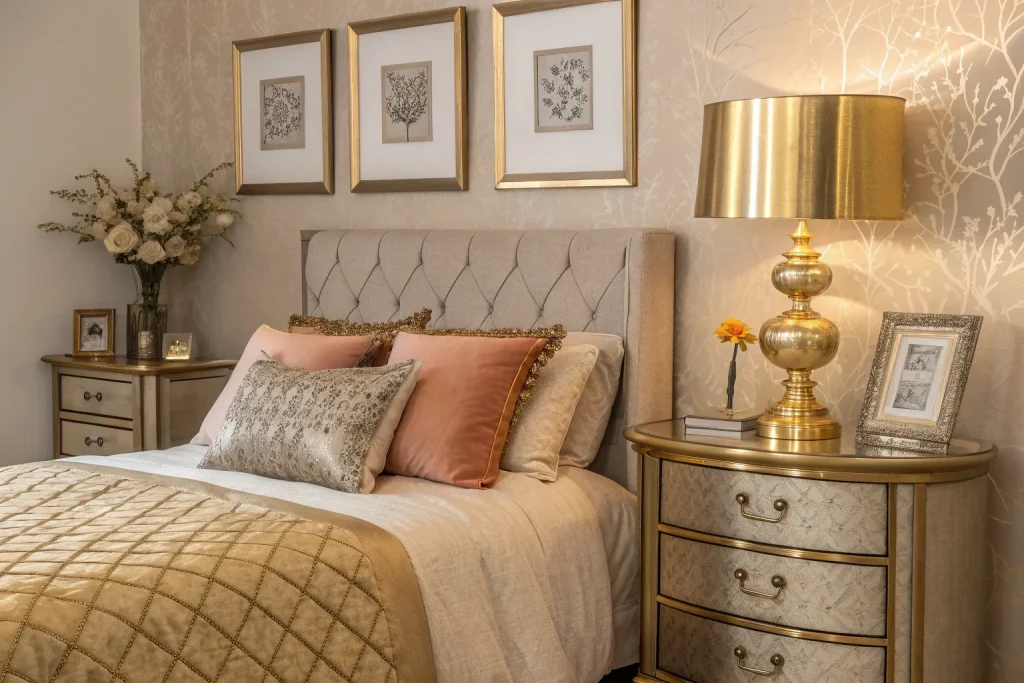Gold, copper, or bronze accents add warmth that silver cannot. Hardware swaps or a framed mirror costs around $50–$150, so this is cheap to moderate. Metallics reflect warm light and make the room feel elegant without overdoing it. It’s a subtle but powerful upgrade.