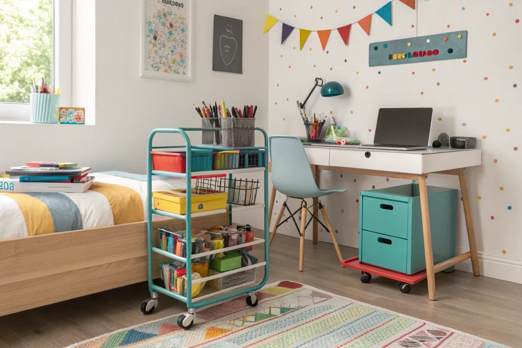 Rolling carts offer portable storage that can move anywhere it’s needed. They’re perfect for art supplies, toys, or electronics. When not in use, they can be tucked into a corner. This mobility keeps the room flexible and clutter-free. Cost: $25–$60 (cheap).