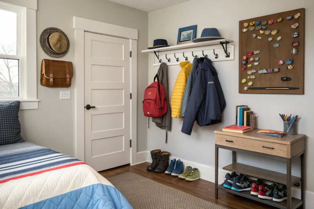 Hooks and racks keep frequently used items off the floor and within easy reach. They’re ideal for bags, jackets, hats, or sports gear. This saves closet space and keeps the room looking neat. They’re easy to install and remove if needed. Cost: $10–$40 (super cheap).