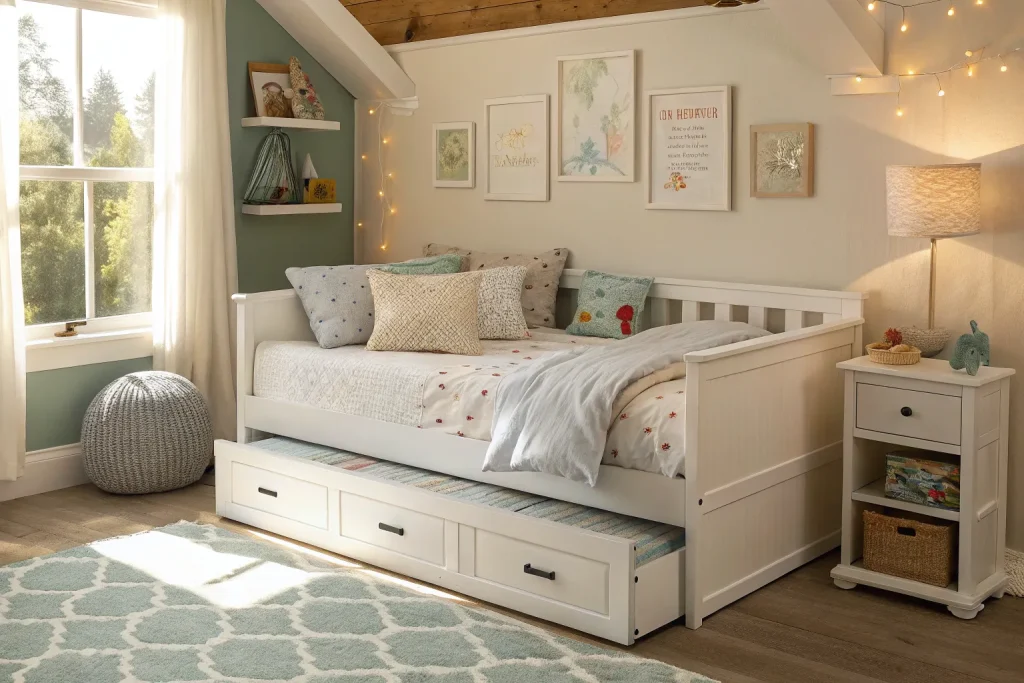 A daybed with a trundle is a great space-saver for sleepovers or guests. The trundle rolls out when needed and disappears when not in use. During the day, it serves as a sofa for lounging. This versatility is perfect for small rooms. Cost: $200–$500 (moderate).