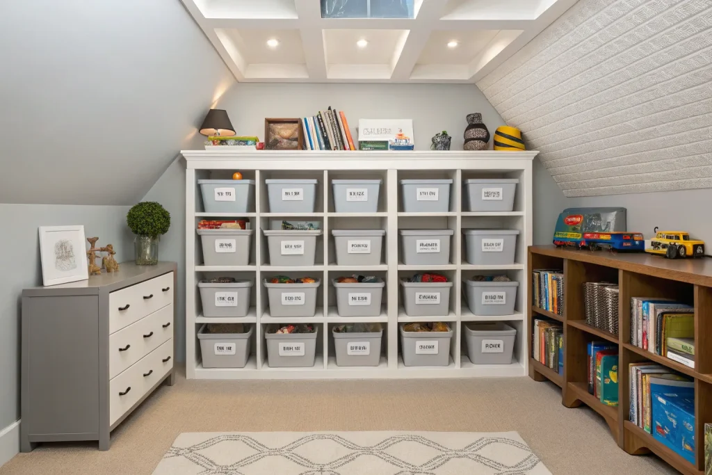 Stackable bins keep belongings organized and make the most of vertical space. They’re great for toys, clothes, or school supplies. This setup makes it easy to rearrange storage as needed. Clear bins help find things quickly. Cost: $20–$60 (cheap).