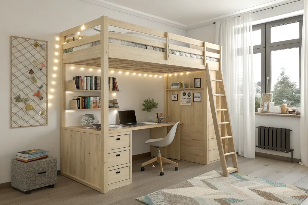 A loft bed transforms vertical space into a multi-use zone, giving a cozy sleeping spot above and a work or play area below. It keeps the floor clear for movement, which is essential in a small room. This setup also works well for teens who need a quiet corner for homework. You can even add extra storage underneath for toys or books. Cost: $250–$500 (moderate).