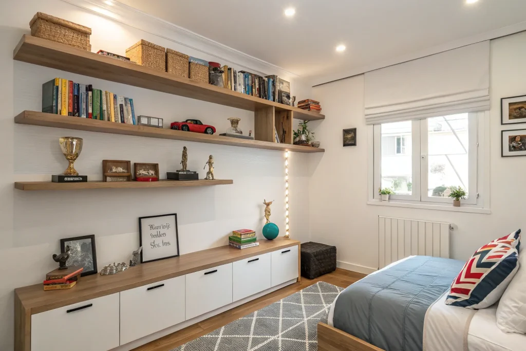Floating shelves maximize wall space while keeping the floor open for other furniture. They’re ideal for displaying books, trophies, or small collectibles without cramping the room. This design keeps everything organized and visually appealing. Plus, they’re easy to rearrange or add more when needed. Cost: $30–$80 (cheap).