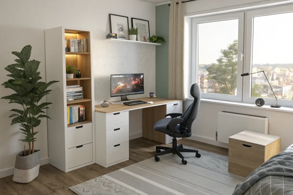 A corner desk makes use of an often-ignored space while leaving the center of the room open. It’s perfect for studying, gaming, or hobbies without taking up valuable wall space. The shape allows for more surface area than a straight desk. This layout keeps the room balanced and functional. Cost: $80–$200 (moderate).