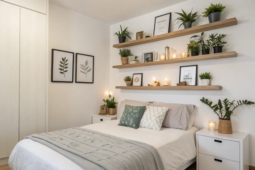 Floating shelves save floor space and display your favourite items. They work well in small bedrooms where storage is limited. Styling them with plants, books, or candles adds a personal touch. Prices range from $30–$70, making it moderately cheap.