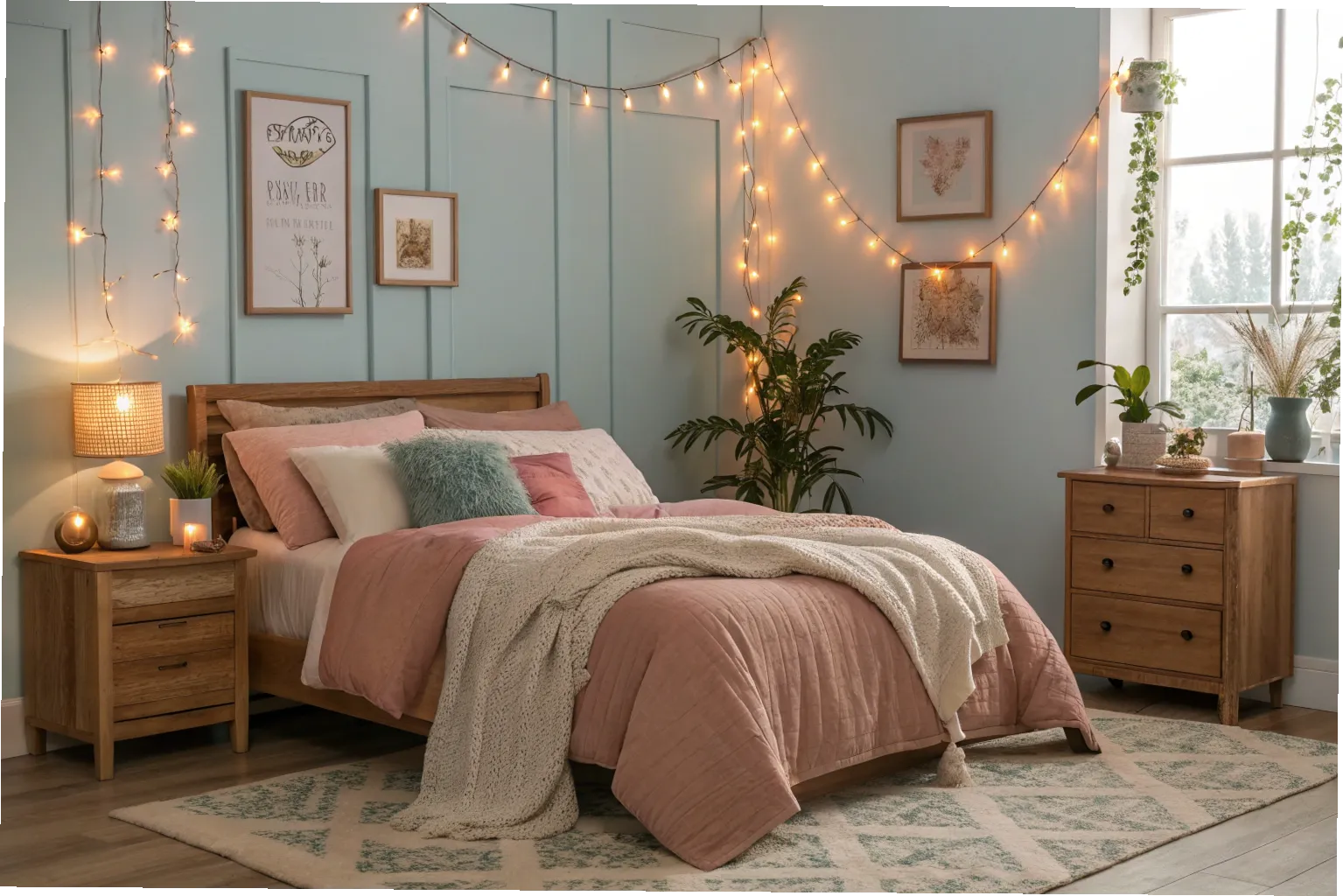 Fairy lights add instant warmth and charm without overpowering your space. Their soft glow creates a relaxing atmosphere perfect for winding down at night. You can hang them above your bed, along shelves, or around mirrors for a magical touch. This idea costs around $15–$30, making it a cheap upgrade for big impact.