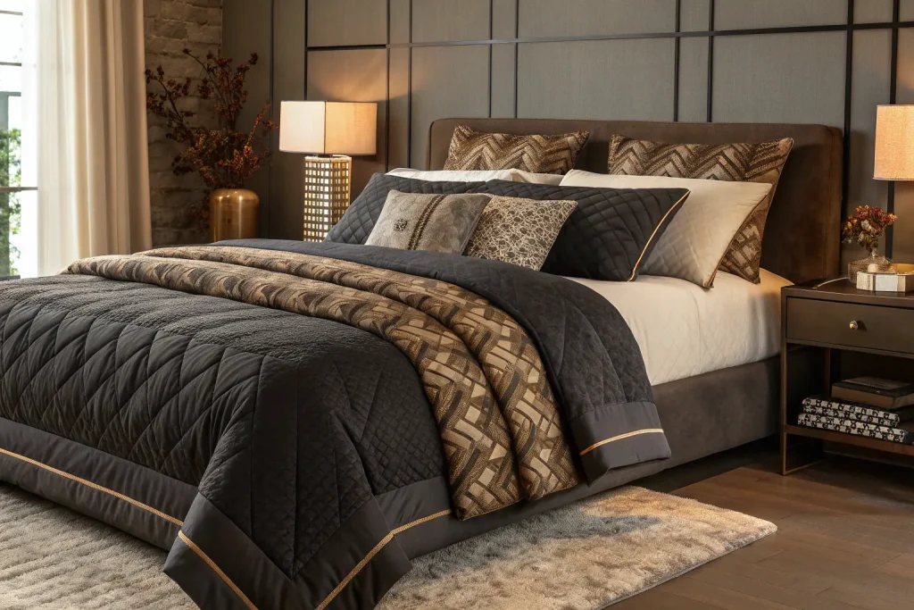 Layered bedding makes your bed look luxurious and welcoming. Combining sheets, comforters, and throws adds dimension and comfort. Dark base colors with lighter accents create the perfect cozy contrast. At $80–$250, it’s mid-range.