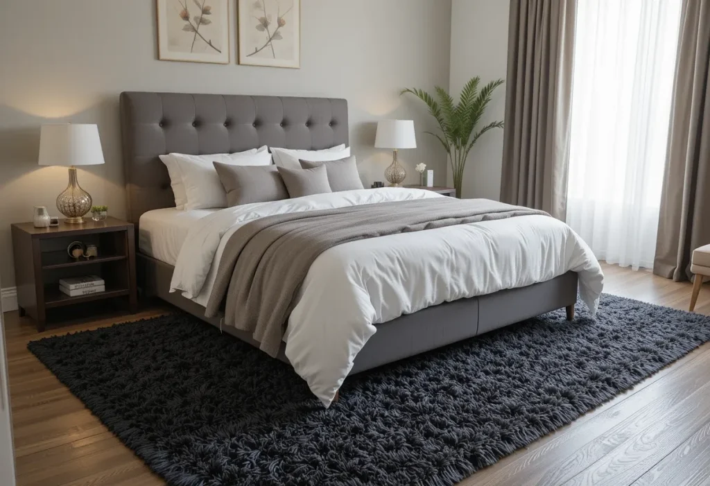 A dark area rug under the bed anchors the entire space. It provides comfort underfoot and enhances the room’s depth. The rug helps define the bed area, especially in larger rooms. At $120–$400, it’s mid to expensive.