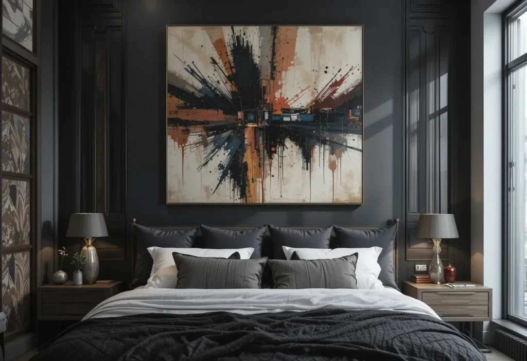 Oversized art makes a bold statement without adding clutter. Dark frames tie it into the bedroom’s moody aesthetic. This works well over the bed or on a main wall. At $100–$500, it’s mid to expensive.