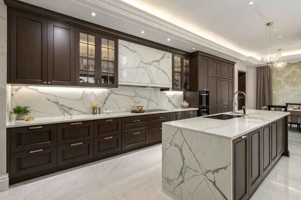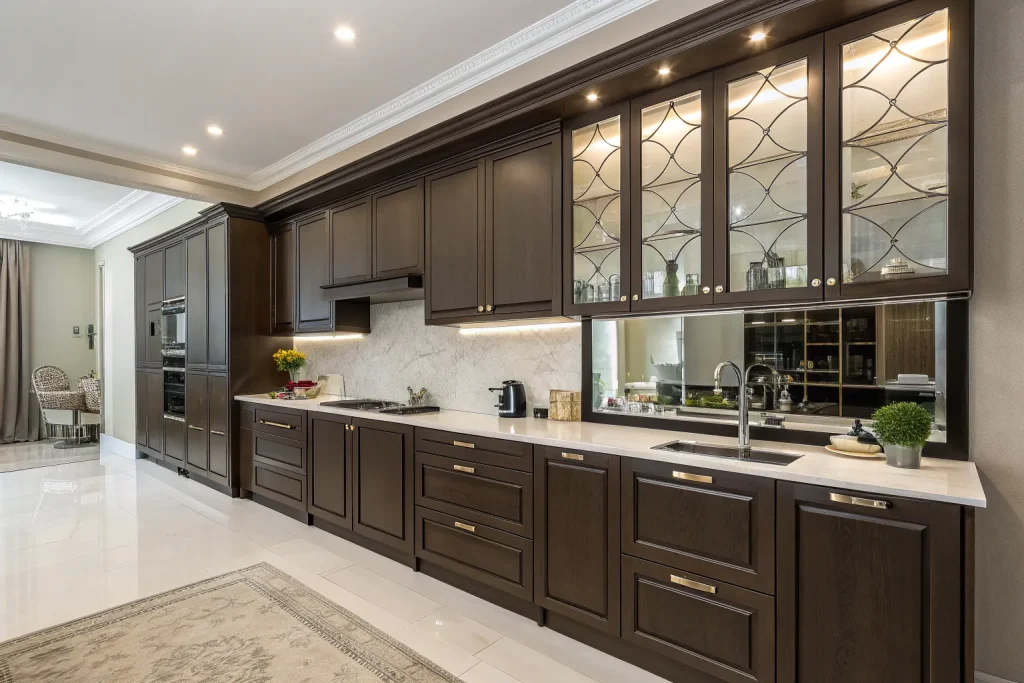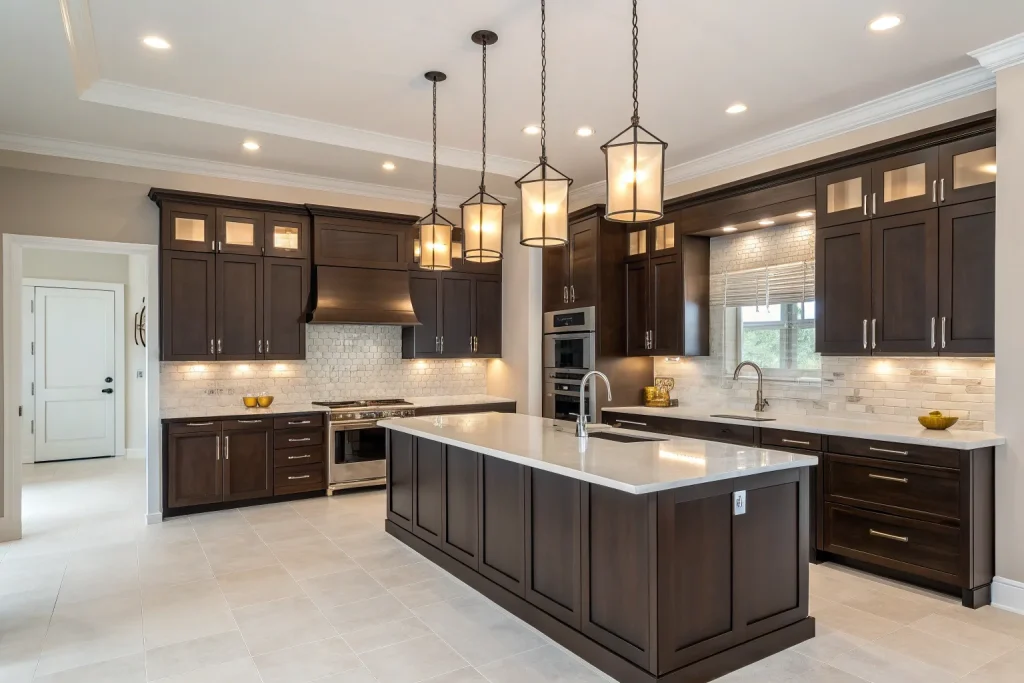 Dark brown cabinets look heavy on their own, but pairing them with white countertops creates balance and freshness. The light surface reflects brightness while the cabinets keep the kitchen grounded in warmth. This mix works in small kitchens too, since it prevents the space from feeling too closed in. On average, quartz or marble countertops cost around $1,500–$4,000, which makes this a fairly expensive upgrade.