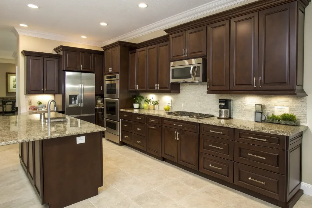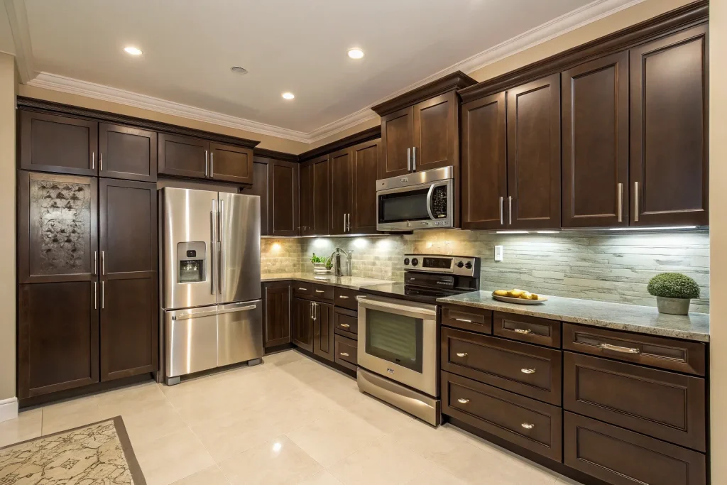 Dark brown cabinetry pairs effortlessly with stainless steel appliances for a sleek, modern finish. The reflective surfaces balance the deep tones while keeping everything clean and stylish. This combo works especially well if you want a kitchen that feels contemporary but still warm. Appliance sets run $2,000–$5,000, making this an expensive choice.