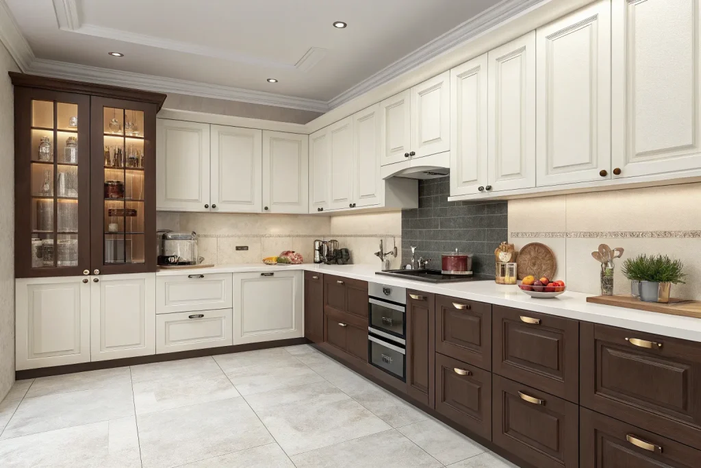 Combining white uppers with dark brown lowers balances heaviness and adds a custom, stylish feel. The two-tone design keeps the kitchen bright on top while grounding it at the bottom. This approach works in both modern and traditional homes. Cabinet replacements can run $3,000–$7,000, so this is definitely expensive.
