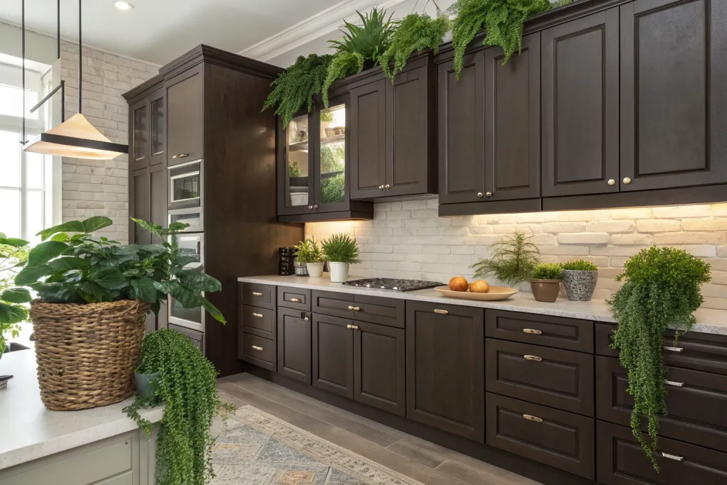 Greenery softens the weight of dark cabinetry and makes the space more inviting. Plants bring life and natural contrast that pairs beautifully with deep wood tones. It’s also one of the cheapest ways to update a kitchen instantly. With costs of $10–$50 per plant, this is a very cheap upgrade.