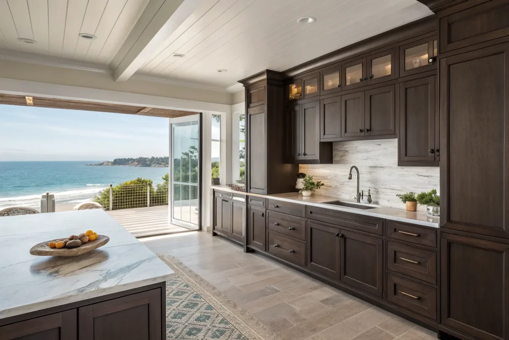 Flat-front dark brown cabinets combined with minimal hardware create a modern, clutter-free kitchen. The clean lines emphasize sophistication and allow the cabinetry to become the main feature. This approach works best if you enjoy simplicity and open counter space. With costs ranging from $5,000–$10,000 for custom cabinetry, this is an expensive design.