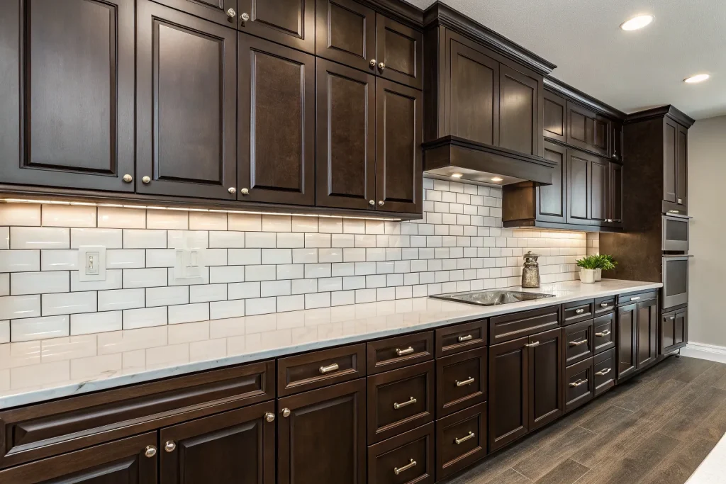 Dark brown cabinets can feel too intense, but pairing them with a white subway tile backsplash instantly brightens the space. The contrast creates a timeless look that balances warmth with freshness. It also adds texture without overwhelming the design, making it suitable for almost any kitchen style. With tiles costing about $3–$7 per square foot, this is a cheap and stylish idea.