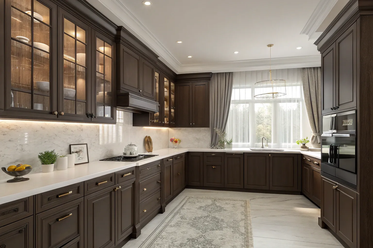 Dark brown cabinets look heavy on their own, but pairing them with white countertops creates balance and freshness. The light surface reflects brightness while the cabinets keep the kitchen grounded in warmth. This mix works in small kitchens too, since it prevents the space from feeling too closed in. On average, quartz or marble countertops cost around $1,500–$4,000, which makes this a fairly expensive upgrade.