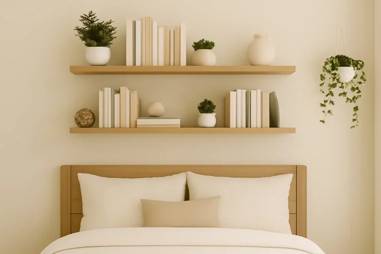 Floating shelves go right on your walls. They help you store things without taking up floor space. You can put books, plants, or little decorations on them. These shelves come in different shapes and sizes. Try placing them above your bed or desk. They also make your walls look more interesting. It’s a clean and modern way to stay organized.