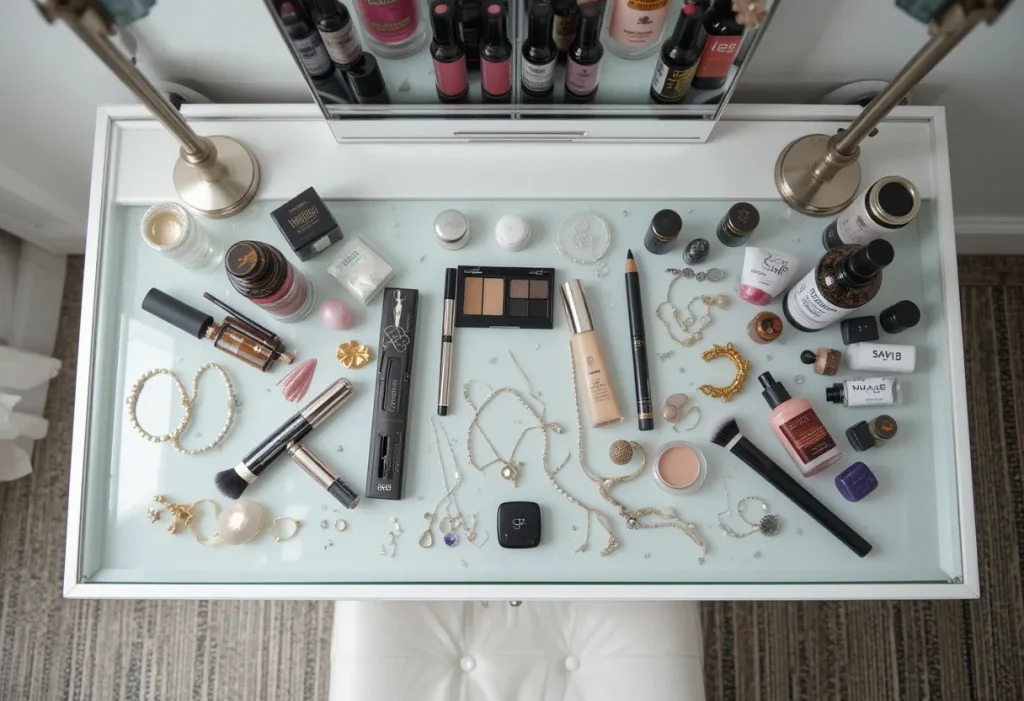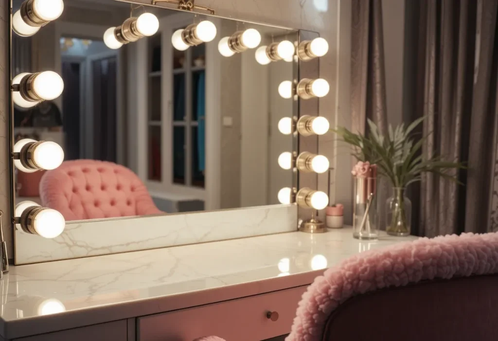 A compact vanity with a stool is a smart choice when floor space is limited. The stool tucks neatly under the vanity, keeping the area tidy and easy to walk around. This setup works well in small bedrooms or when the vanity is placed against a busy wall. It’s stylish without being overwhelming. Approximate cost: $70–$90 (cheap).