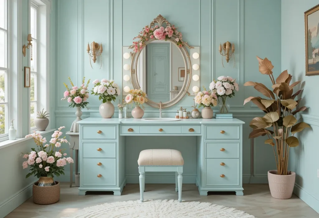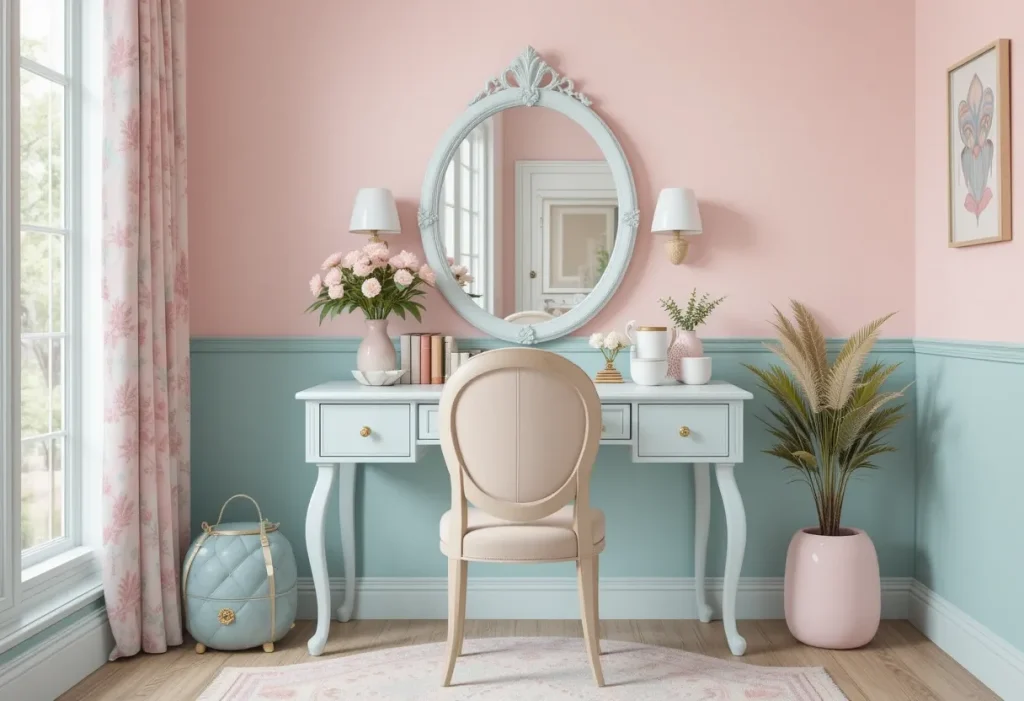 A pastel palette vanity uses soft colors like mint, blush, and baby blue to create a calming, dreamy atmosphere. These shades work beautifully in cozy or cottage-themed bedrooms. The light tones keep the vanity from feeling bulky. This look feels cheerful without being overwhelming. Approximate cost: $80–$100 (cheap).