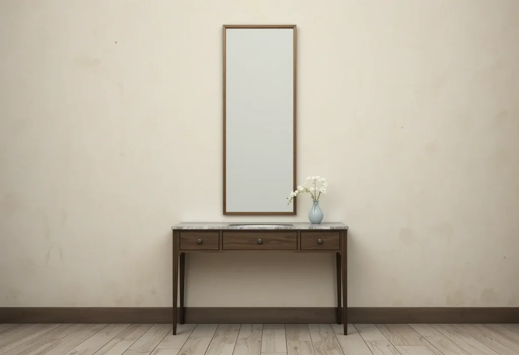 A tall mirror vanity doubles as a dressing mirror while giving your room an open, spacious feel. The vertical design draws the eye upward, making the ceiling seem higher. It’s perfect for adding height to small rooms. This setup is both functional and stylish. Approximate cost: $100–$120 (moderate).