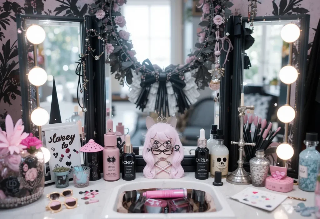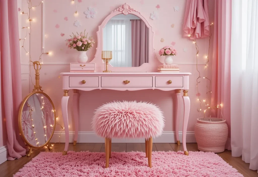 A themed vanity matches the rest of your room’s style, whether it’s beachy, gothic, or kawaii. It ties the entire design together for a cohesive look. This approach makes the vanity part of the bigger picture instead of a stand-alone piece. It’s a fun way to express creativity. Approximate cost: $80–$100 (cheap).
