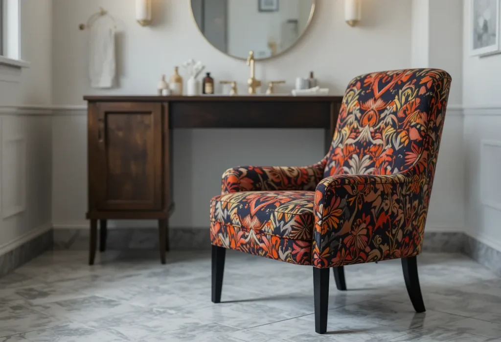 A statement chair vanity lets the seating be the star of the setup. Bold patterns, textures, or colors make it pop against the vanity. This style works well when the vanity itself is simple. It adds personality without overcrowding the design. Approximate cost: $90–$110 (moderate).