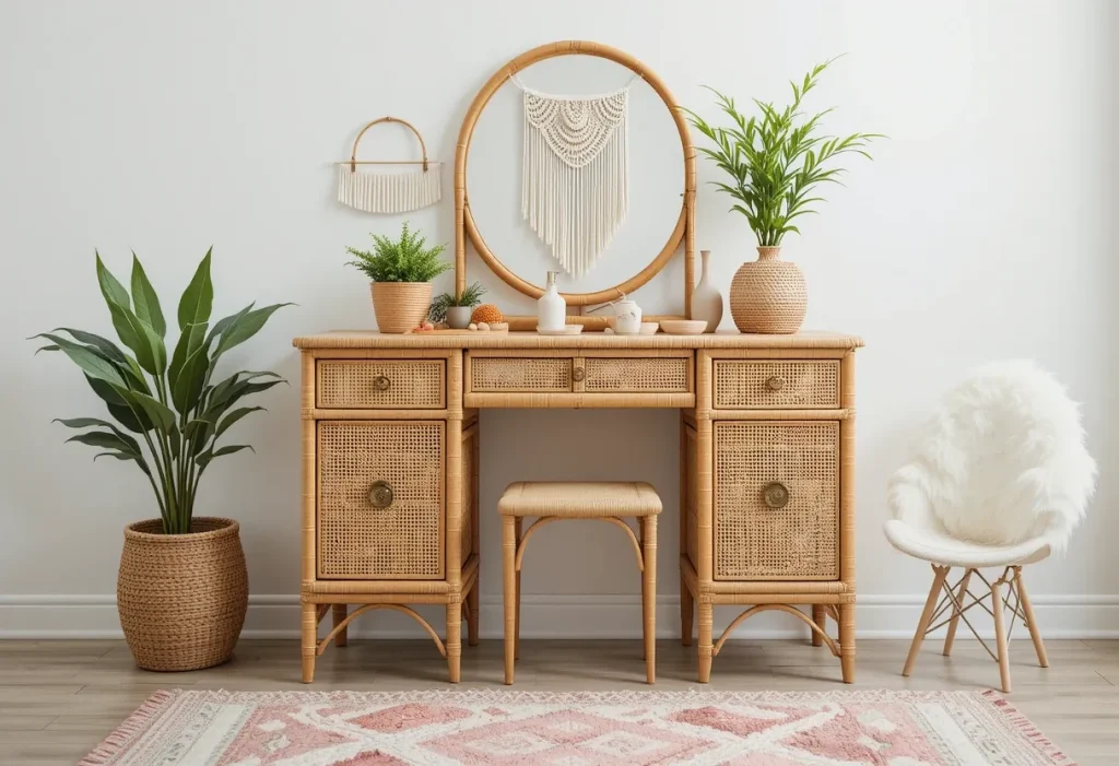 A boho chic vanity brings warmth, color, and personality into your Toca Boca bedroom. Natural materials like rattan, wicker, and wood mix beautifully with patterned textiles. This style feels relaxed and artistic without trying too hard. It’s ideal if you love eclectic designs that still have a cozy, welcoming vibe. Approximate cost: $80–$110 (moderate).