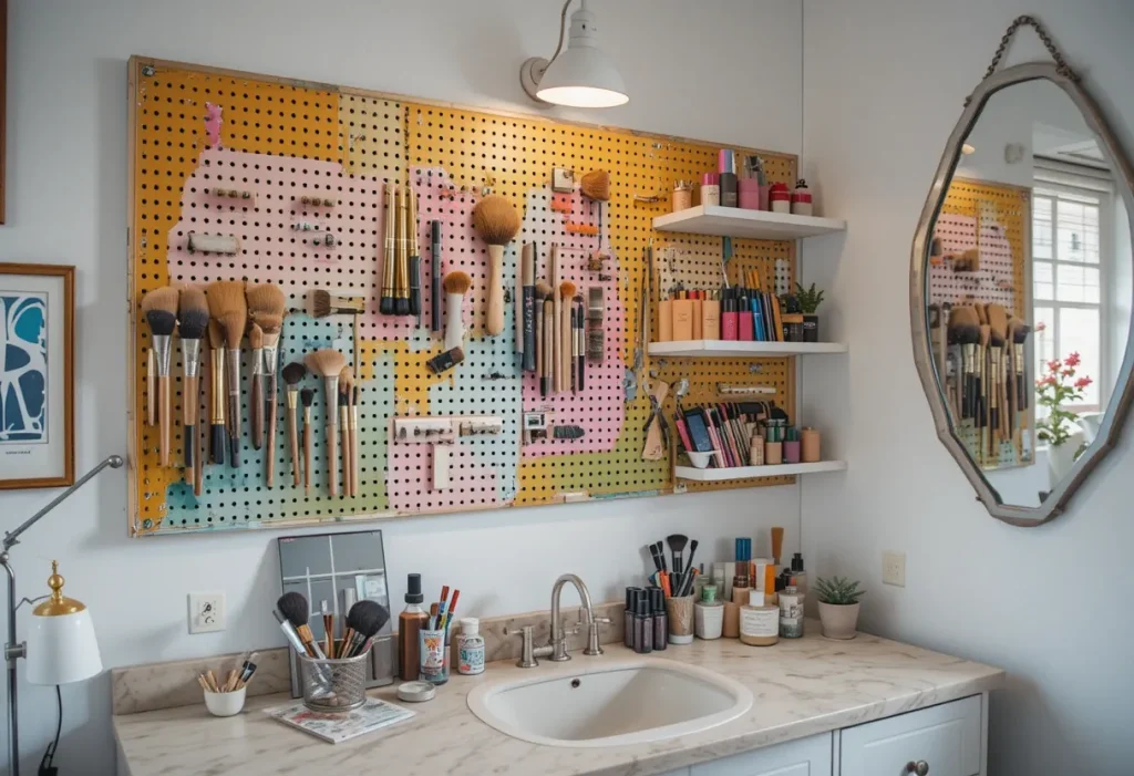 Pegboard vanities are perfect when you need serious organization with a side of style. This idea is best because you can customize hooks and shelves to suit your routine. Everything is visible, tidy, and within reach. Approximate cost is $30–60, making this a very cheap and efficient setup.