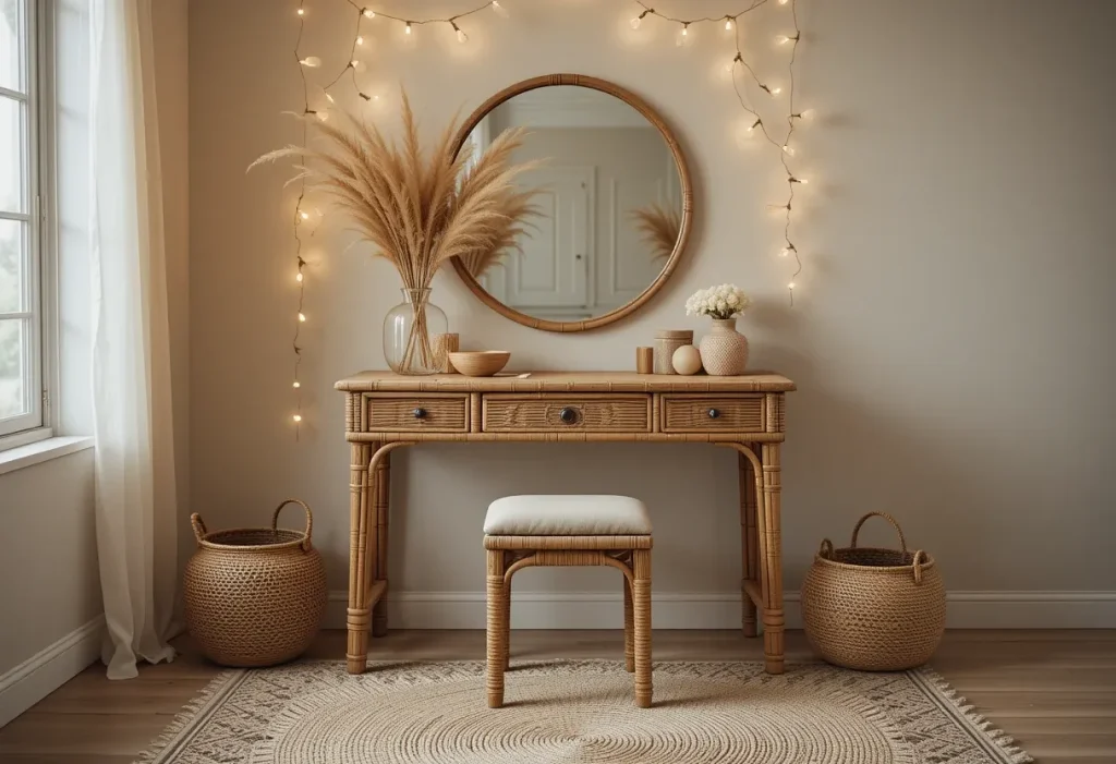 Boho rattan vanity setups are best when you’re after a relaxed, earthy vibe. The textures add depth, and it feels effortlessly stylish. You get a warm, inviting space that doubles as a decor statement. Approximate cost is $80–150, which makes this a more expensive but worthwhile DIY.