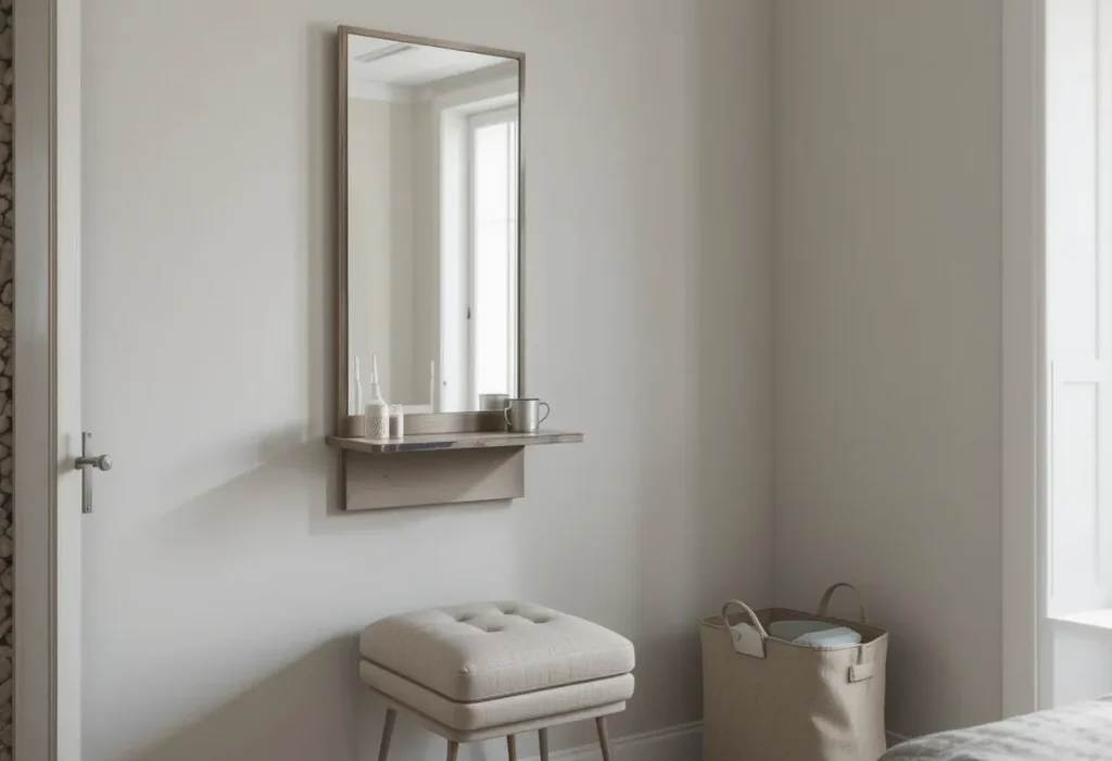 A floating vanity shelf is perfect when you’re tight on space but still want a functional glam zone. This idea works wonders because it gives the illusion of more room, and you can customize it to fit any wall. It’s sleek, minimal, and super easy to clean around. With no bulky legs in the way, it also keeps the area feeling airy and modern. Approximate cost is $40–70, making this a cheap and practical solution.